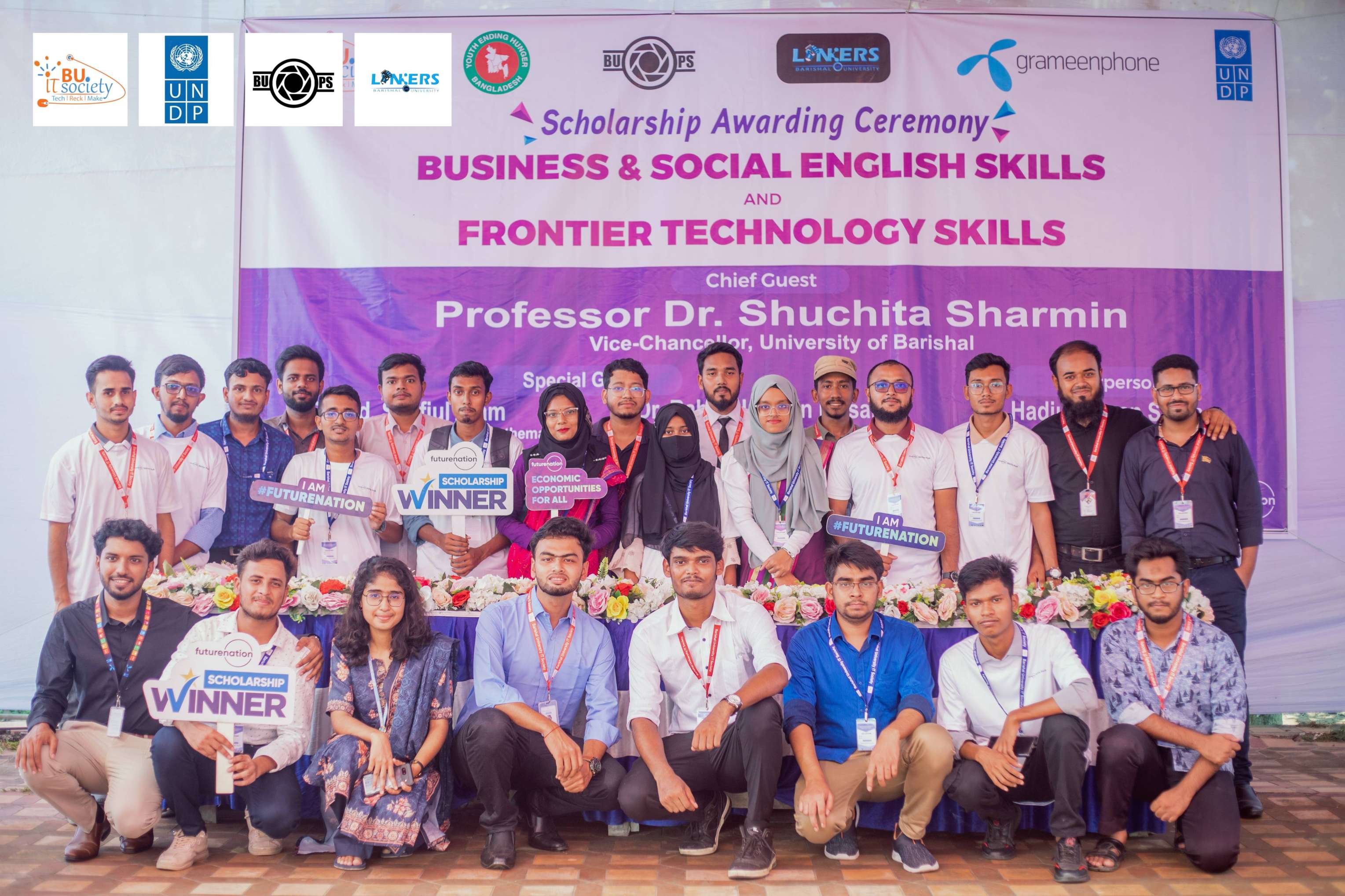 The Scholarship Awarding Ceremony for the Business & Social English and Frontier Technology Skills courses was held at the open stage field of Barishal University. The event was organized jointly by the Barishal University IT Society and the United Nations Development Programme (UNDP).